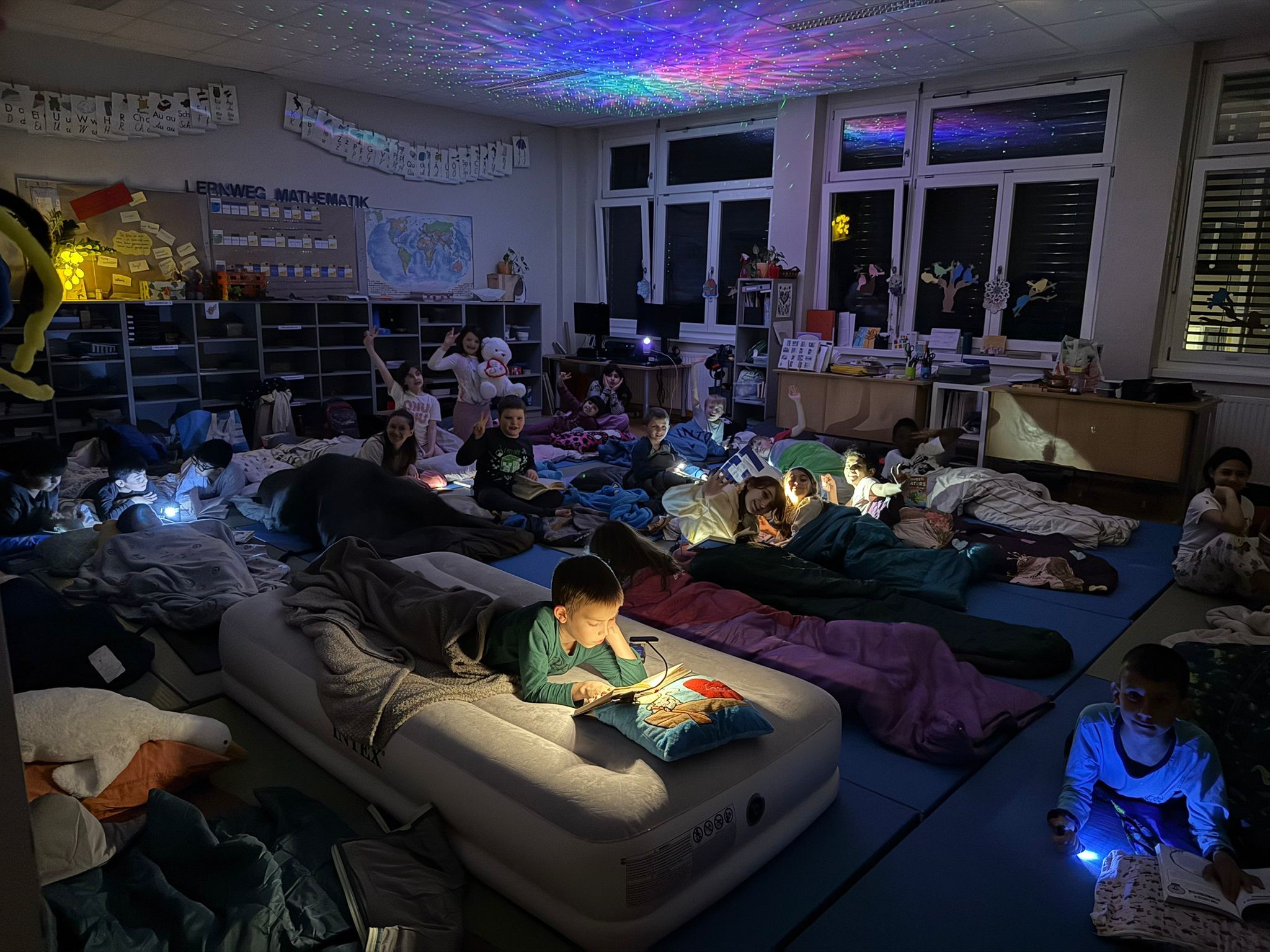 Gelesen wird bei uns zu allen Tageszeiten. Besonders viel Spaß macht es bei einer Lesenacht in der Schule ; )